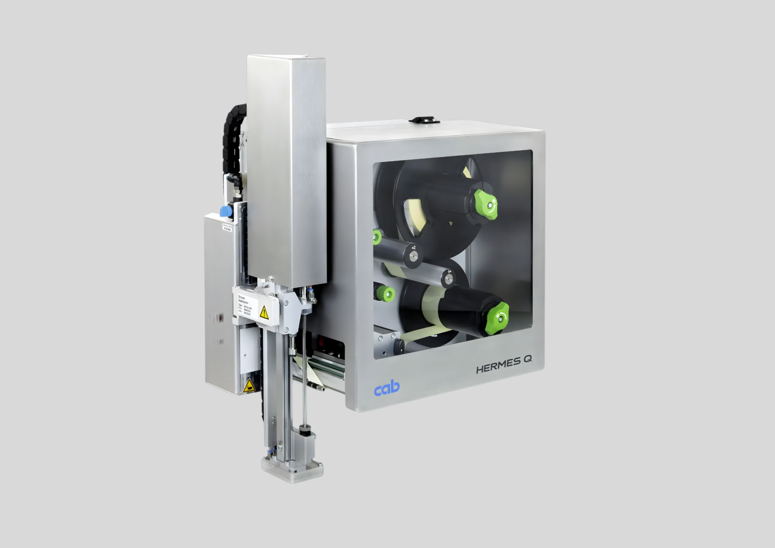 The Cab Hermes Q is an industrial grade print-and-apply labelling system built for high volume, automated pallet labelling. Engineered for reliability in demanding logistics and warehousing environments, it prints variable GS1-compliant labels in real time and applies them to one or more sides of a pallet with absolute precision. Whether integrated into stretch wrappers, conveyors, or palletising cells, Hermes Q ensures traceability, compliance, and operational efficiency.