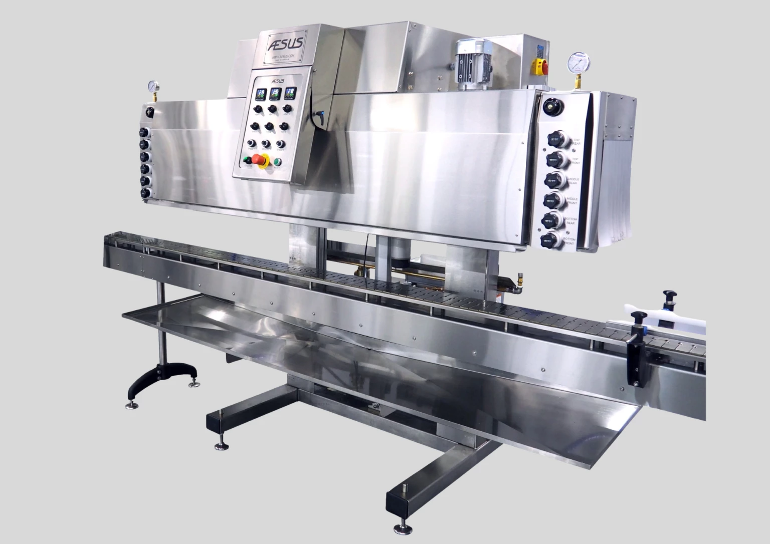 The AESUS Heat Tunnel delivers precise, uniform shrink performance across all sleeve materials and container shapes. Available in both steam and dry heat configurations, it ensures a smooth, bubble-free finish for tamper-evident, full body, or combo sleeves. Engineered for efficiency and reliability, the system integrates seamlessly with all AESUS applicators to create a complete, professional sleeving solution.