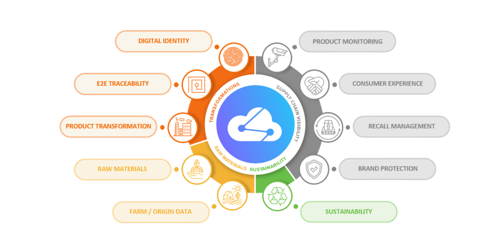 The model shows how our traceability platform connects every stage of a product’s journey – from farm and raw materials, through processing and transformation, right through to retail and the end consumer.